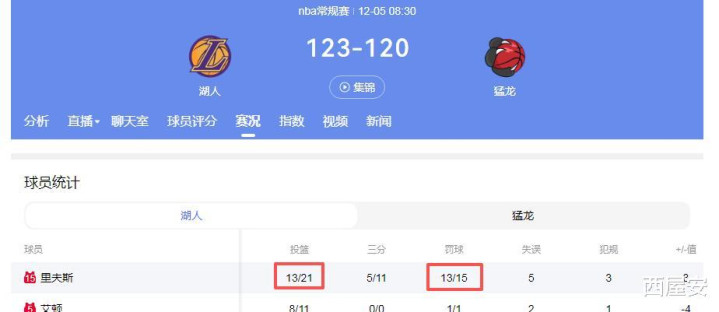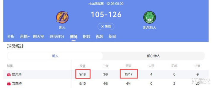 12月06日对阵凯尔特人,虽然湖人输了,但是里弗斯全场18中9得到36分(17次罚球);