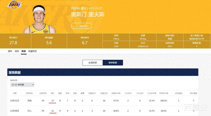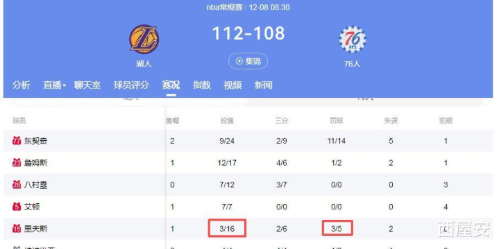 12月08日对阵76人,里弗斯16中3仅得到11分(5次罚球);